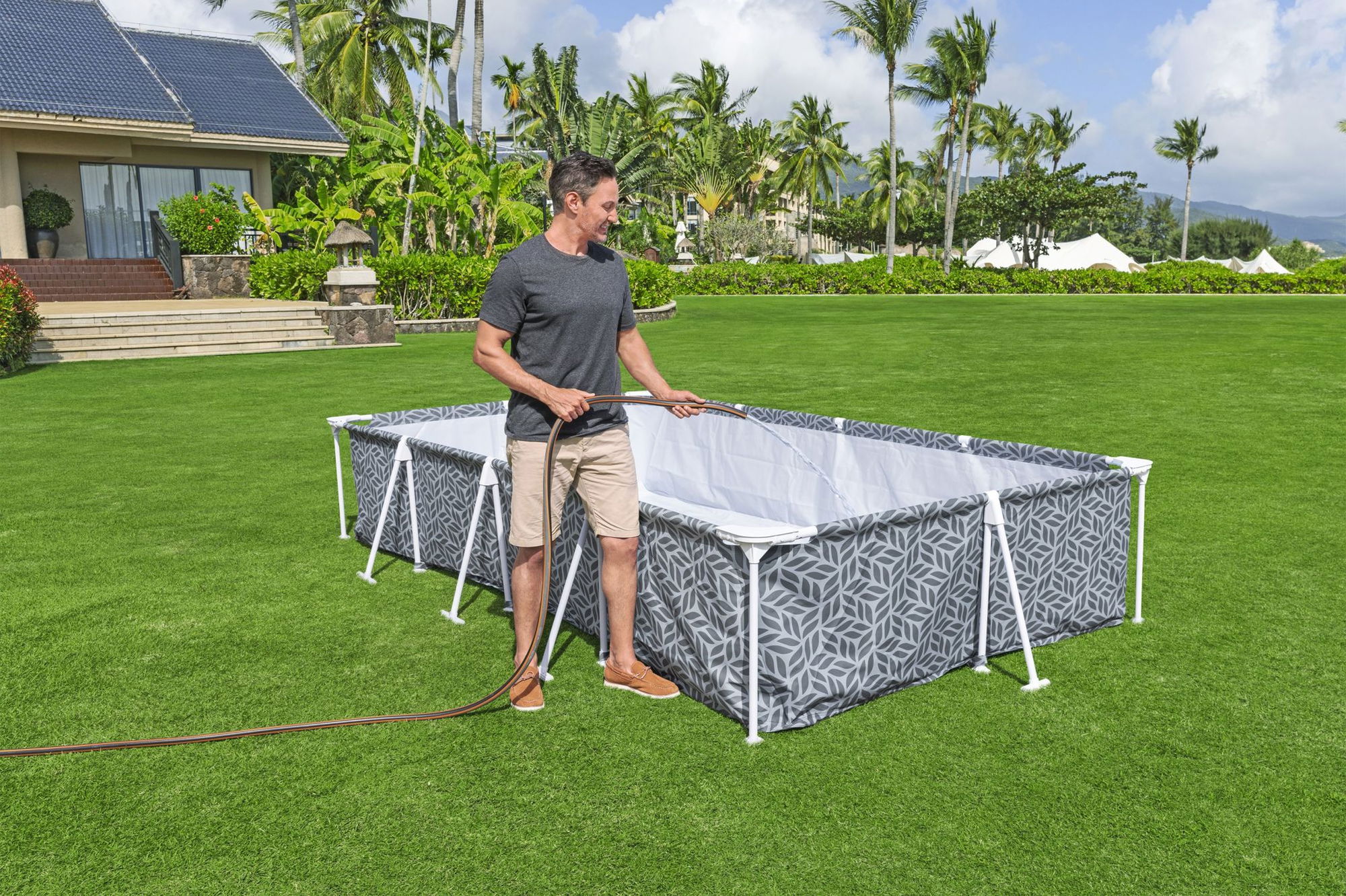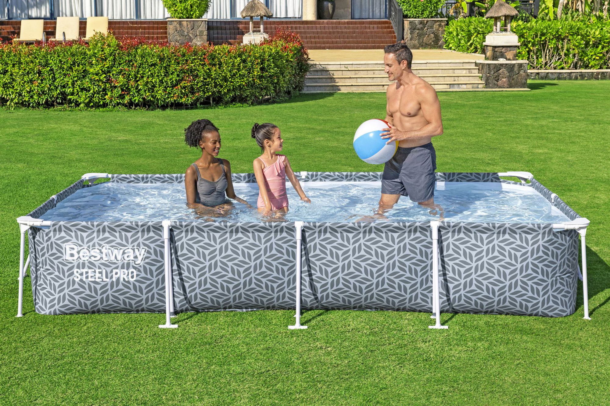 ## Blattform-Design mit hellblauer Innenverkleidung Optisch setzt das Bestway Steel Pro Frame Pool Set auf ein Blattform-Design der Außenwände. Dieses Motiv fügt sich harmonisch in viele Gartenumgebungen ein und sorgt für eine lebendige, sommerliche Anmutung. Die hellblaue Innenverkleidung unterstützt eine freundliche Wasserwirkung, sobald der Pool befüllt ist. Durch die Kombination aus eckiger Form, Blattmotiv und hellblauem Innenraum wird der Pool zum dekorativen Blickfang und ergänzt Sitz- und Liegebereiche auf der Terrasse oder im Garten. ## Filterpumpe und Zubehör im Set Zum Lieferumfang des Bestway Steel Pro Frame Pool Sets gehört eine passende Flowclear Filterpumpe