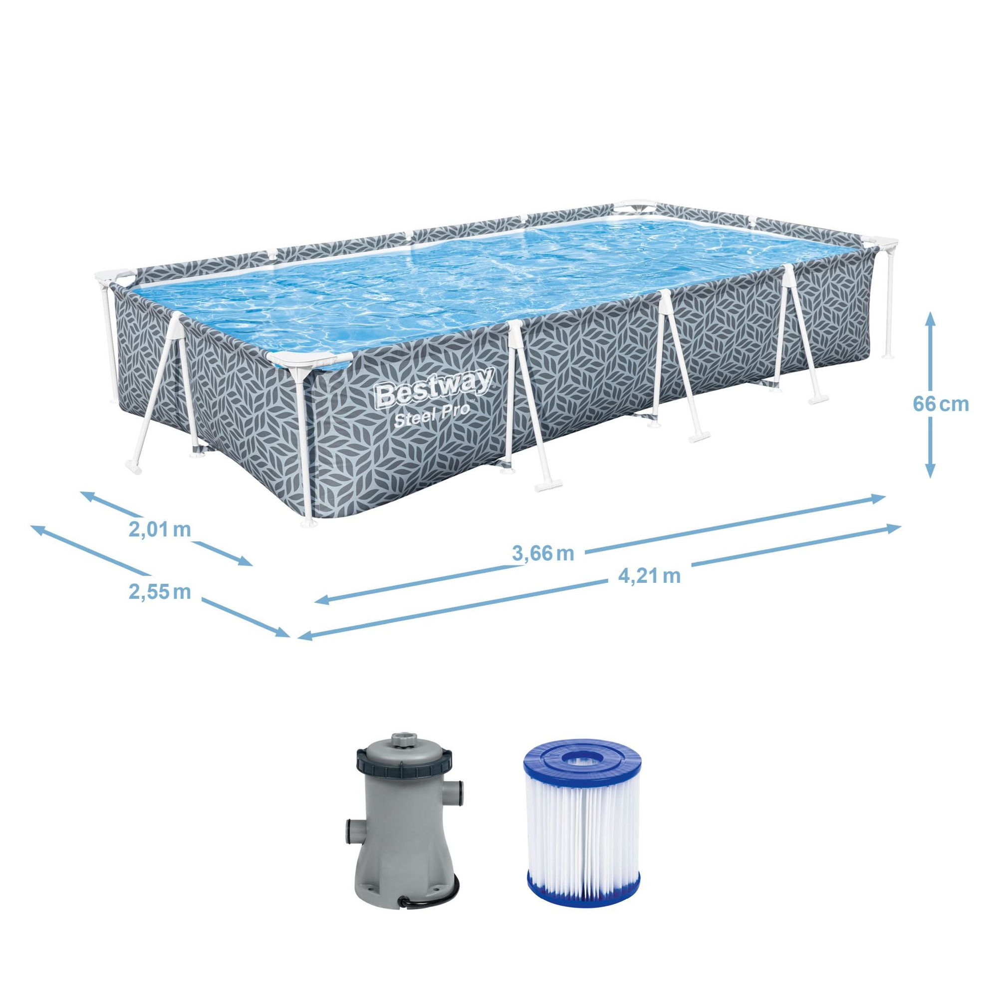 - Modell: Steel Pro Frame Pool Set mit Filterpumpe 366 x 201 x 66 cm, Blattform-Design, eckig