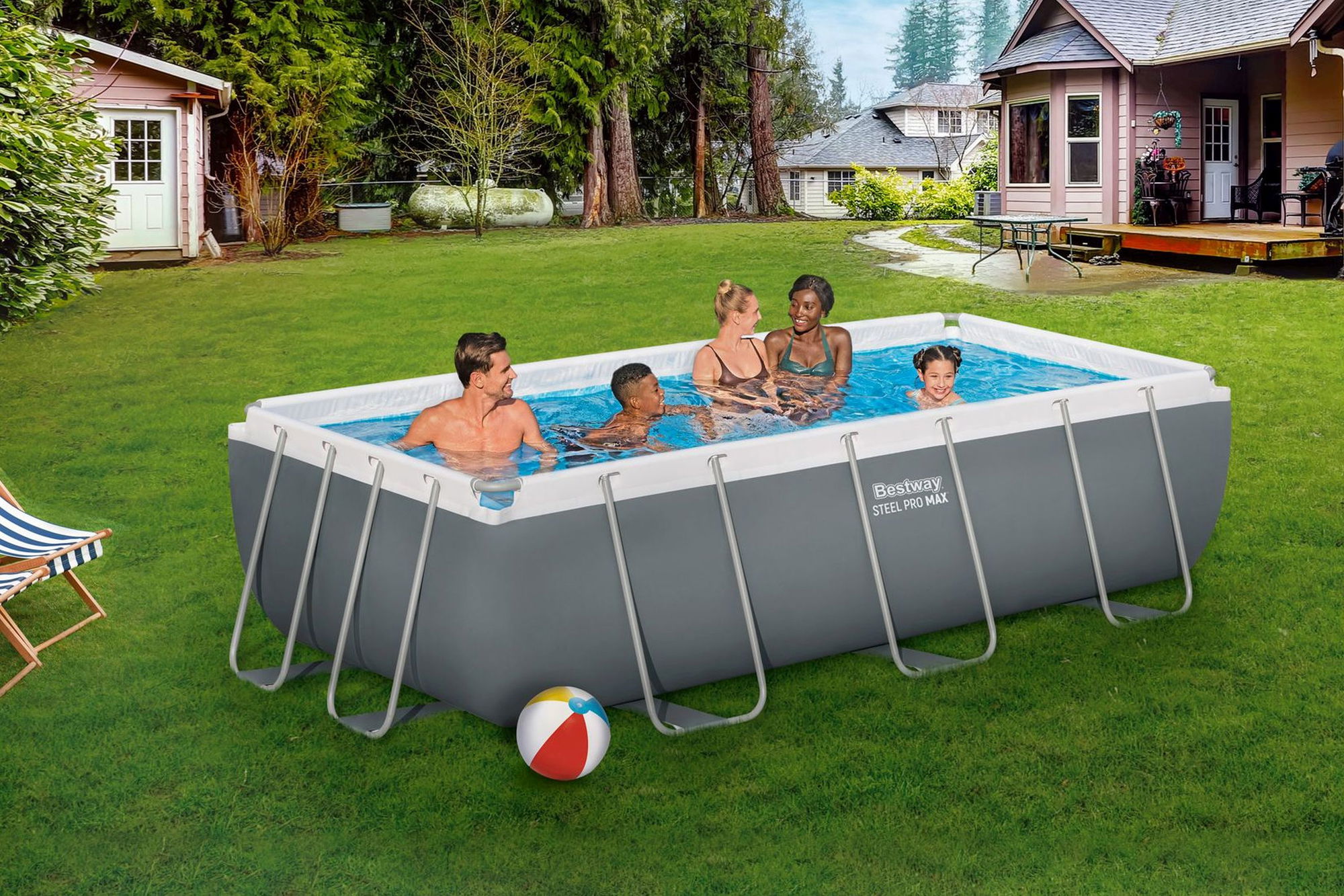 - **Rechteckiger Familienpool:** Steel Pro MAX Frame Pool mit 404 x 201 x 100 cm und ca. 6.478 l Wasserkapazität (bei 90 % Füllung).