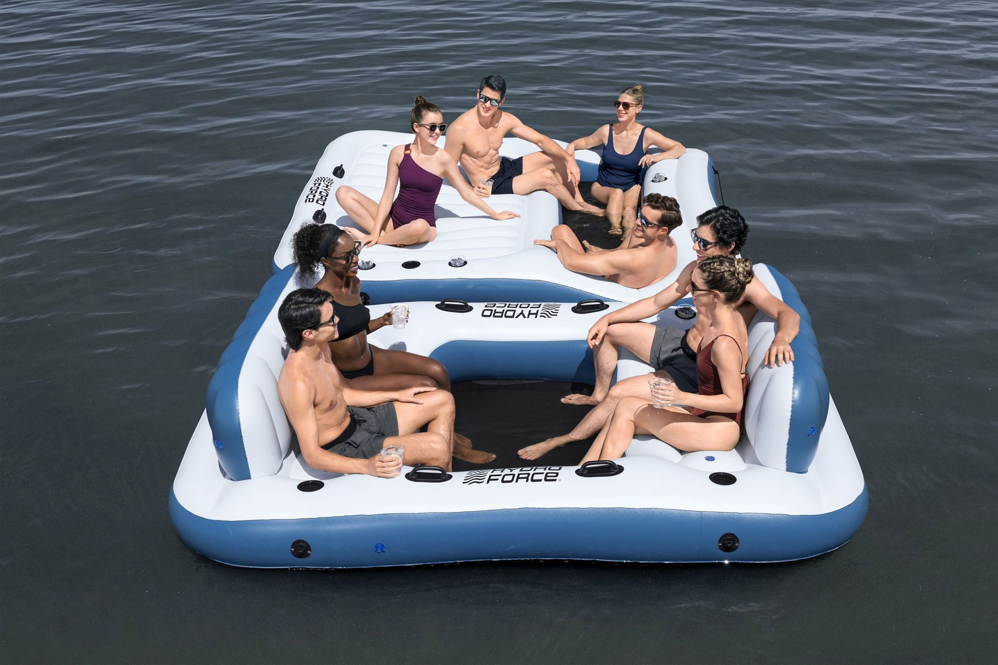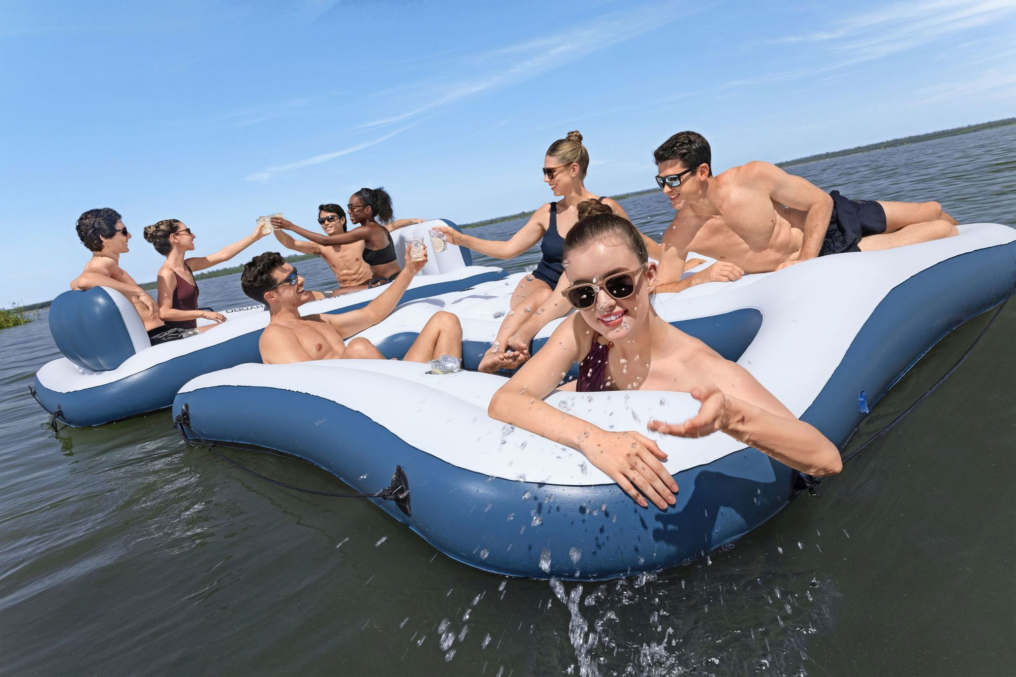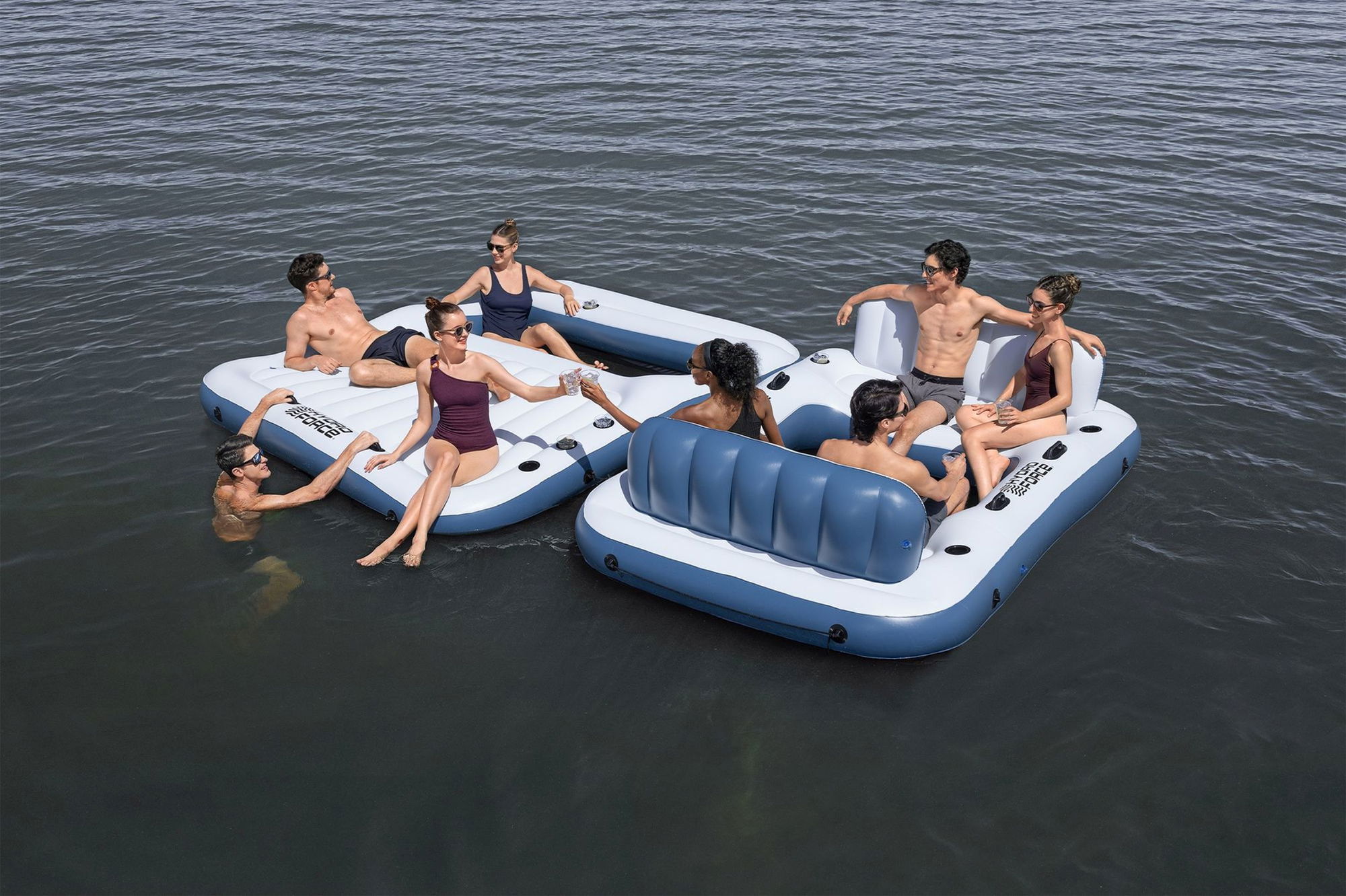 ## Maximaler Komfort für bis zu 8 Personen Die Badeinsel ist speziell auf Komfort ausgelegt: Zwei extragroße Rückenlehnen laden zum Zurücklehnen ein und machen das Sitzen oder Liegen besonders angenehm. Die durchdachte Anordnung von 8 Getränkehaltern stellt sicher, dass Flaschen und Becher sicher stehen, ohne im Wasser zu landen. So genießen Sie kühle Drinks, während Sie entspannt auf der Wasseroberfläche treiben. Robuste Haltegriffe rund um die Insel erleichtern das Festhalten im Wasser und geben zusätzliche Sicherheit, etwa beim Ein- und Aussteigen. Die breite Liege- und Sitzfläche bietet sowohl genügend Platz zum Sonnenbaden als auch für gesellige Runden mit Freunden.