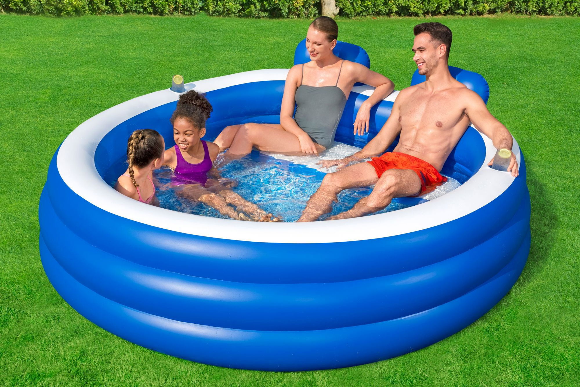 ### Für wen eignet sich der Bestway Family Pool Splash Paradise 231 x 219 x 79 cm? Der Pool richtet sich an Familien und Gartenbesitzerinnen und -besitzer, die einen bequemen, optisch attraktiven Family Pool suchen. Dank der integrierten Sitzbank, der Kopfstützen, der Getränkehalter und der stabilen PVC-Konstruktion ist der Bestway Family Pool Splash Paradise 231 x 219 x 79 cm eine attraktive Wahl für alle, die ihren Außenbereich in eine kleine Relax- und Wohlfühlzone verwandeln möchten.