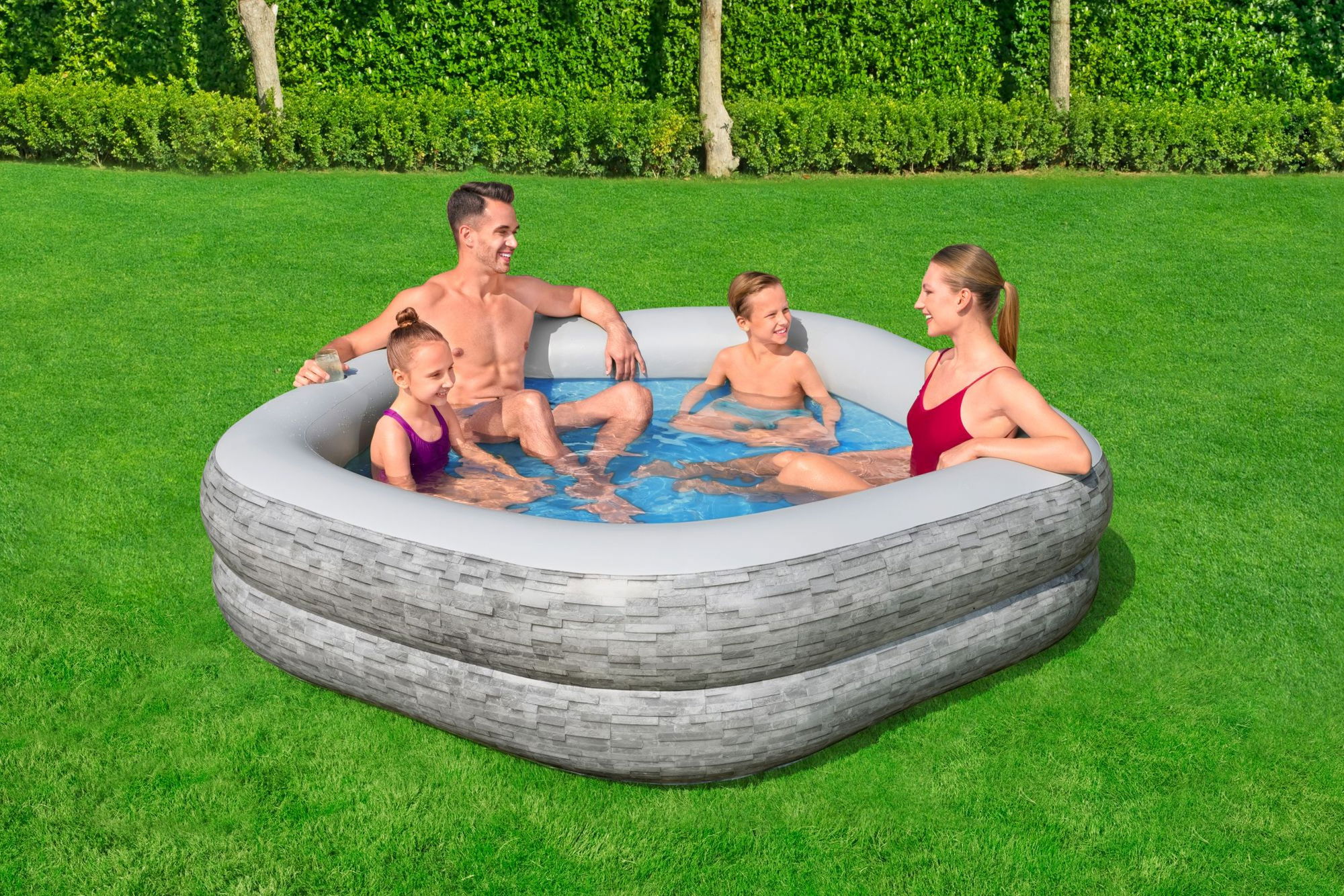 Der Bestway Family Pool TruPrint 213 x 206 x 53 cm Steinwand-Optik ist ein stilvoller Family Pool für den Garten. Der aufblasbare Pool in Steinwand-Optik mit extrabreiten Seitenwänden, zwei integrierten Sitzkissen und Getränkehaltern bietet Platz für entspannte Stunden im Wasser und verwandelt Ihren Außenbereich in eine gemütliche Lounge-Zone.