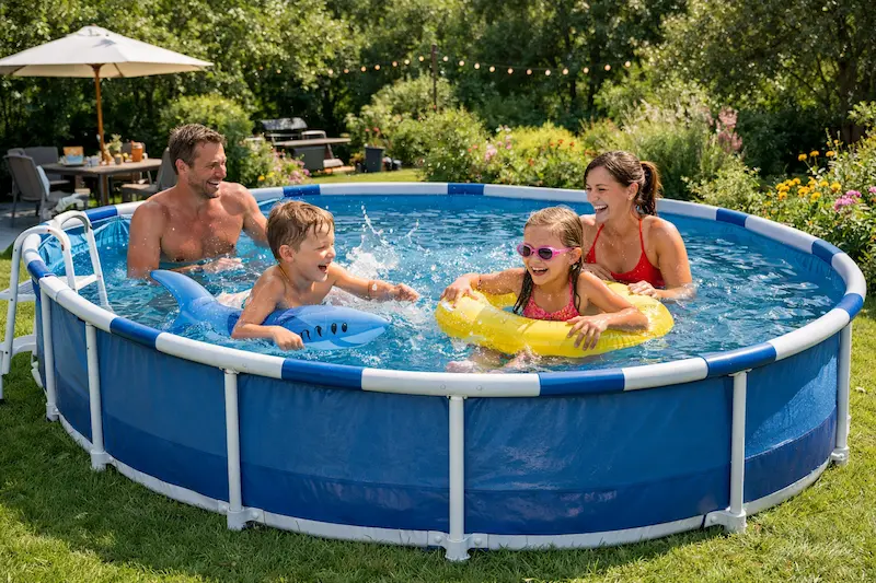 Ein Frame Pool lebt vom Zusammenspiel aus Stahlrahmen und Poolfolie. Hochwertige Rahmen sind korrosionsgeschützt und so konstruiert, dass die Verbindungen sicher sitzen. Die Poolfolie ist meist mehrlagig und auf Reißfestigkeit ausgelegt. Bei Poolplatz findest du runde Frame Pools mit robusten Folienmaterialien, die auf lange Nutzung ausgelegt sind – das zahlt sich aus, wenn der Pool mehrere Saisons stehen soll.