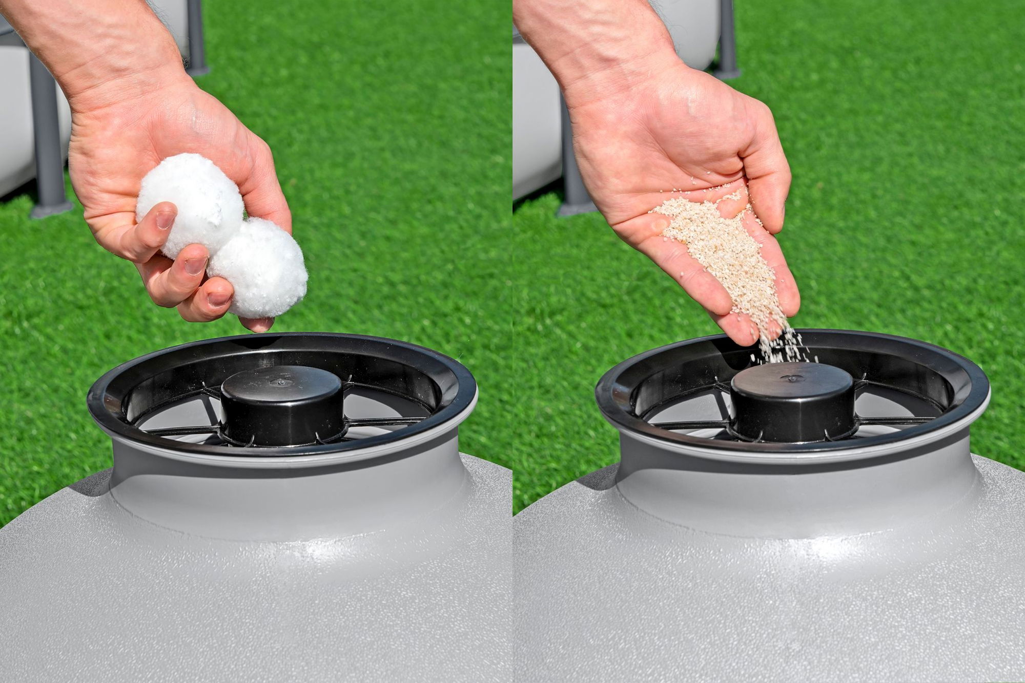 ### Welches Filtermedium wird verwendet? Die Anlage kann wahlweise mit klassischem Quarzsand oder mit modernen Polysphere-Filterbällen betrieben werden. Für den Betrieb mit Sand werden etwa 36 kg Filterquarzsand mit einer Körnung von 0,45–0,85 mm benötigt. Alternativ können Polysphere-Filterbälle (z. B. Bestway Polysphere mit rund 1.000 g) eingesetzt werden, die besonders leicht und einfach zu handhaben sind. Bitte beachten Sie, dass Sand bzw. Filterbälle nicht im Lieferumfang enthalten sind. So können Sie das gewünschte Filtermedium passend zu Ihren Vorlieben separat auswählen und nachrüsten.
