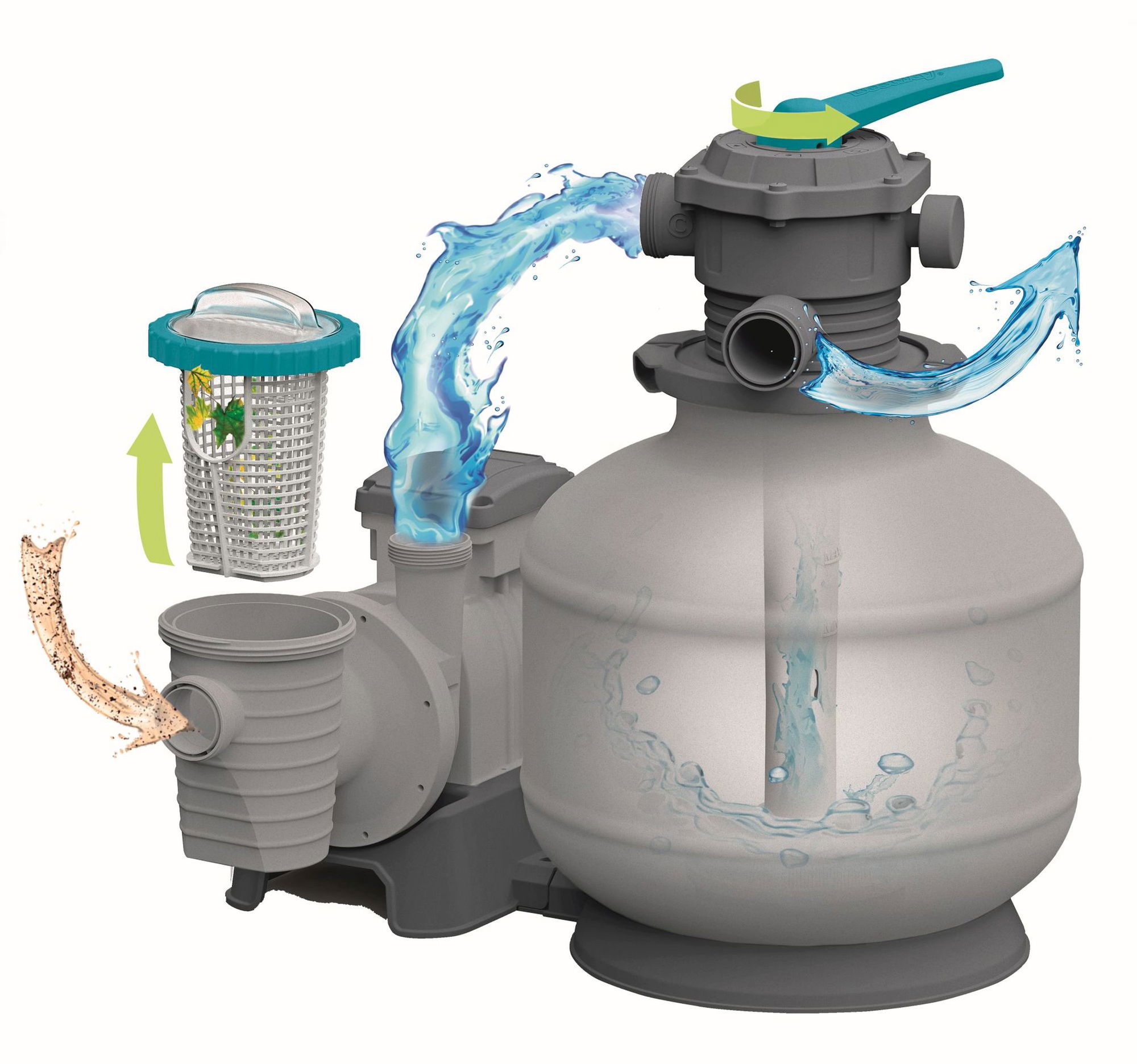 ### Wie funktioniert die Sandfilteranlage? Die Pumpe saugt das Wasser aus dem Pool an, leitet es durch das Filtermedium im Tank und führt es anschließend gereinigt zurück in den Pool. Schmutz, Blätter und feinere Partikel bleiben im Filterbett hängen. Über das 6-Wege-Ventil wählen Sie die gewünschte Funktion, zum Beispiel Filtern, Rückspülen, Nachspülen oder Entleeren. So kombinieren Sie gründliche Reinigung mit wenigen Handgriffen. Ein integrierter Vorfilter mit herausnehmbarem Sieb fängt grobe Verschmutzungen ab und schützt die Pumpe. Das gut ablesbare Manometer zeigt den Systemdruck an und hilft dabei, den richtigen Zeitpunkt für eine Rückspülung zu erkennen. Der robuste, korrosionsbeständige Filtertank mit 38,5 cm Durchmesser ist für den langfristigen Außeneinsatz ausgelegt.