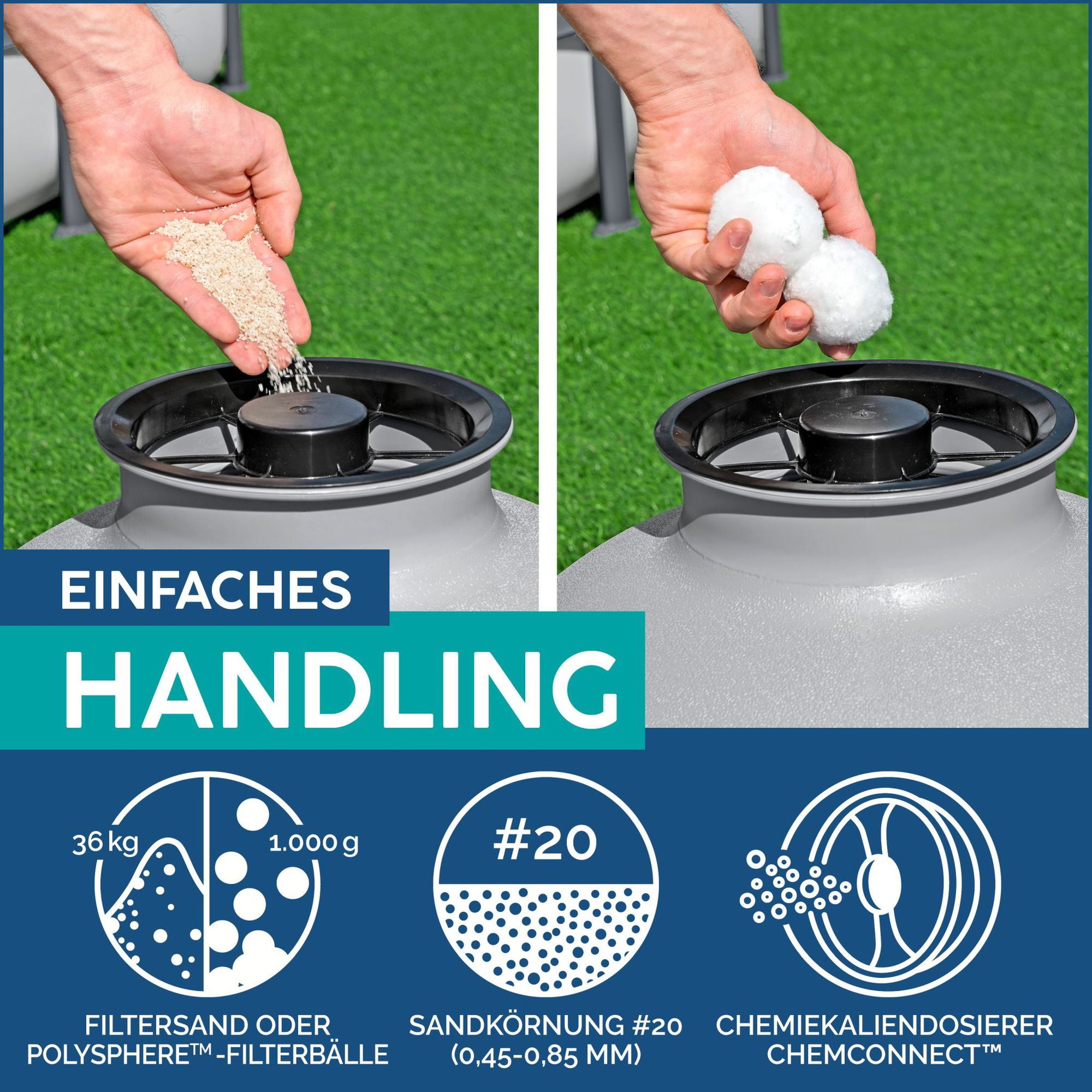 - **Wahl des Filtermediums:** Betrieb mit 36 kg Filtersand (Körnung 0,45–0,85 mm) oder Polysphere-Filterbällen #58475 (1.000 g).