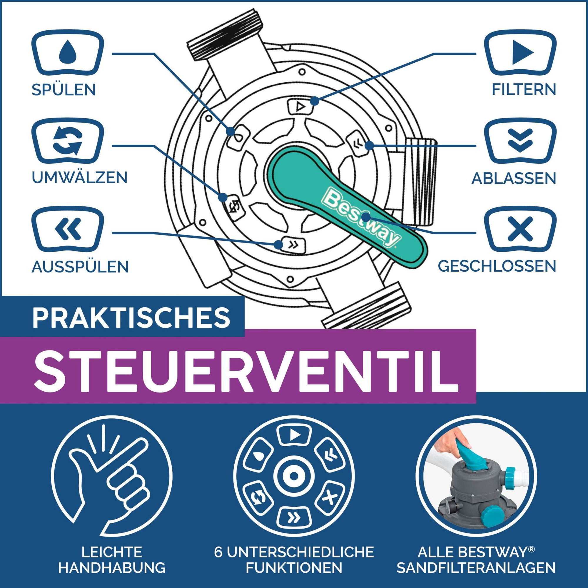 - Betriebsart: Sandfilteranlage mit 6-Wege-Ventil und integrierter Zeitschaltuhr